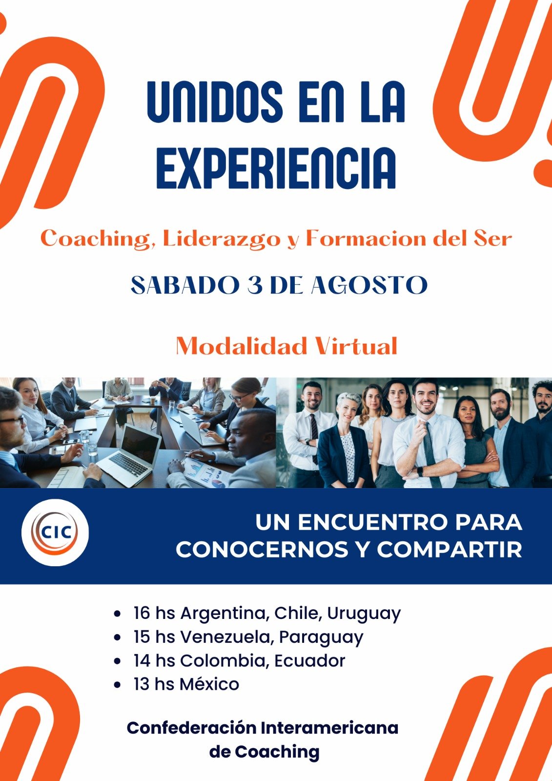 Los invitamos a participar en el webinar «Unidos en la Experiencia, un evento virtual organizado por la Confederación Interamericana de Coaching (CIC), diseñado para aquellos apasionados por el coaching, el liderazgo y el crecimiento personal. Este encuentro se llevará a cabo el sábado 3 de agosto y promete ser una jornada llena de aprendizaje, conexión y transformación.